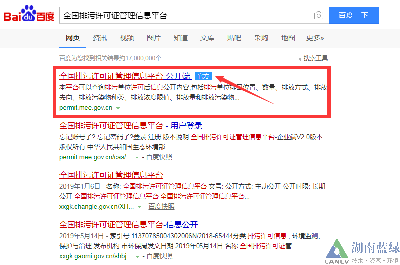 (1)瀏覽器界面,用百度、搜狗等搜索“全國(guó)排污許可證管理信息平臺(tái)”,點(diǎn)擊后登錄網(wǎng)站(如下圖所示)。