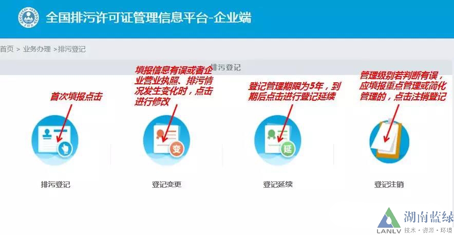 3.2、以登記管理為例,點(diǎn)擊“排污登記” 后。