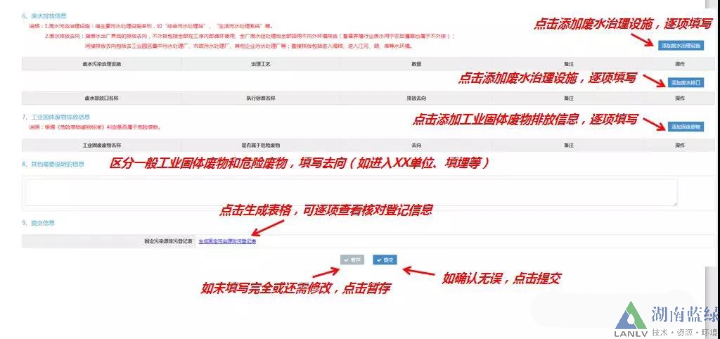 3.6、按以上要求填報(bào)完全后,若仍有不確定,需要修改的地方,可點(diǎn)擊最下方“保存”;若填報(bào)無(wú)誤,點(diǎn)擊最下方“提交”即可。填報(bào)完成后,系統(tǒng)自動(dòng)生成固定污染源排污登記表表格(如附件1)