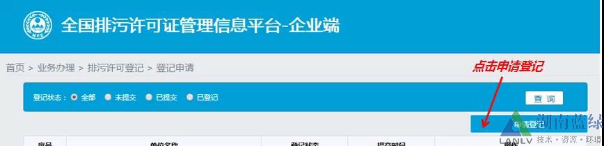 3.3、進(jìn)入“排污登記”后,點(diǎn)擊申請(qǐng)登記。