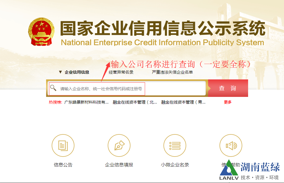 3.確定企業(yè)注冊(cè)地址和統(tǒng)一社會(huì)信用代碼 參考營(yíng)業(yè)執(zhí)照上的信息,也可登錄國(guó)家企業(yè)信用信息公示系統(tǒng)http://www.gsxt.gov.cn/index.html,進(jìn)行查詢(如下圖所示)。